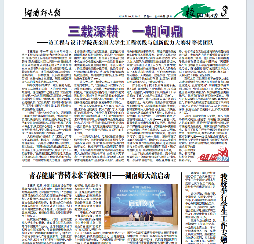 从秋日实验室的星火初燃,到八月赛场的荣光绽放,姚凌志、向朝艳、蔡杰超三人组成的团队,将跨学科的智慧拧成绳,把不懈的努力磨成剑,用从容的勇气破除万难,书写了我校工程学子鲜活生动的成长故事。这段故事里,有青春热血、协作温暖,更有创新力量——这份力量会穿透时光,激励更多我校学子循着科技创新的方向坚定前行,把书本里的知识、实践中的思考,变成笔下的答卷、手中的成果,书写青春与科创交织的精彩华章。