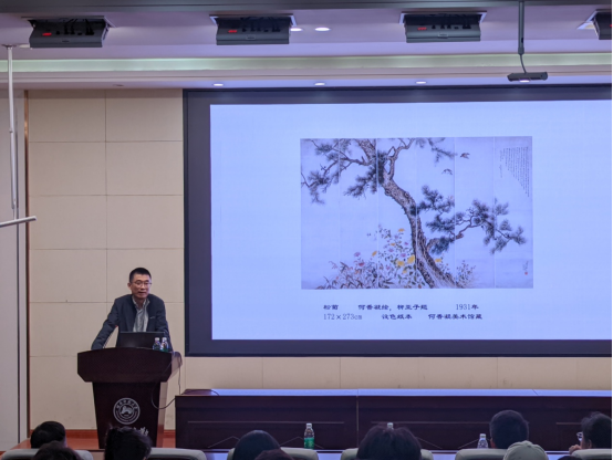 讲座的下半部分,蔡显良教授重点对何香凝专题展览的视觉呈现进行深入探讨。重点介绍了过去五年间专题展的设计亮点和展览中的主要作品。通过展览实例和图片展示,向在场的师生们展示了何香凝艺术作品的深刻内涵和美学价值,以及专题展如何有效地传达和展现艺术作品的独特魅力。