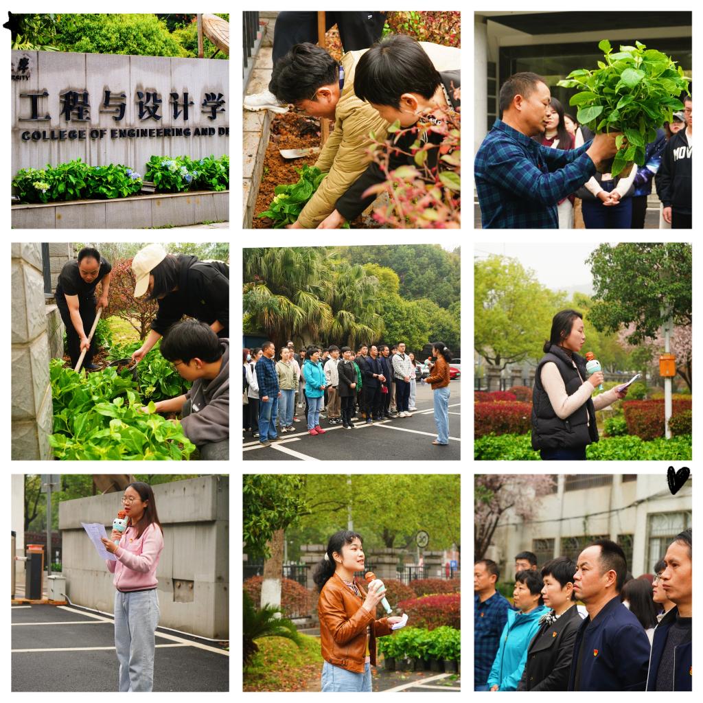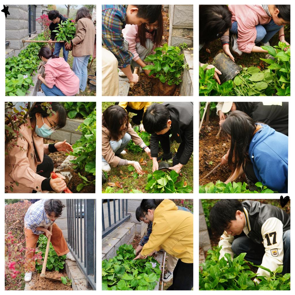 师生党员分工合作,搬运植株、松土挖坑、种植浇水,即使汗流浃背,依然笑容满面,撸起袖子拿起铲子,体验劳动带来的快乐。