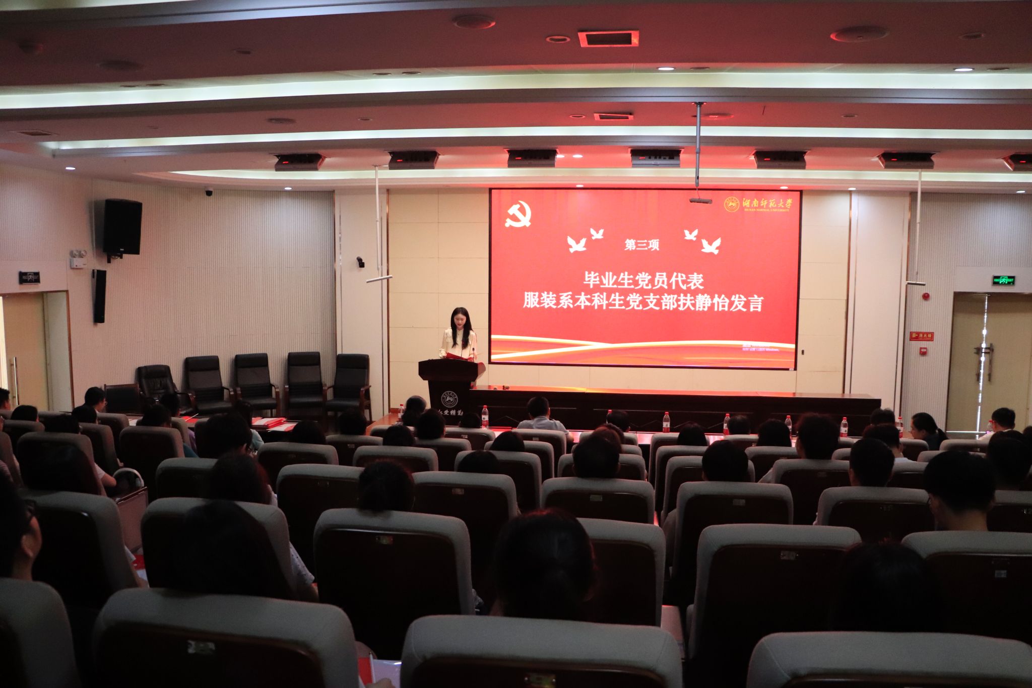 毕业生党员代表、服装系本科生党支部扶静怡发言,号召毕业生党员们常怀感恩之心,听党话、跟党走,怀揣梦想,脚踏实地,敢于担当,成为有理想、敢担当、能吃苦、肯奋斗的新时代好青年。