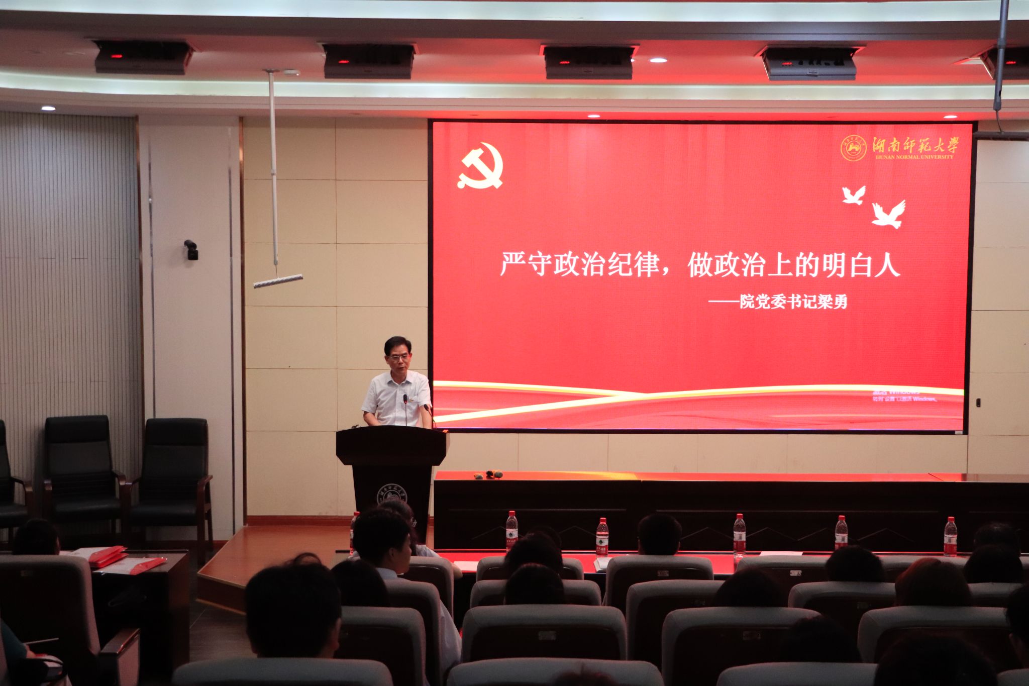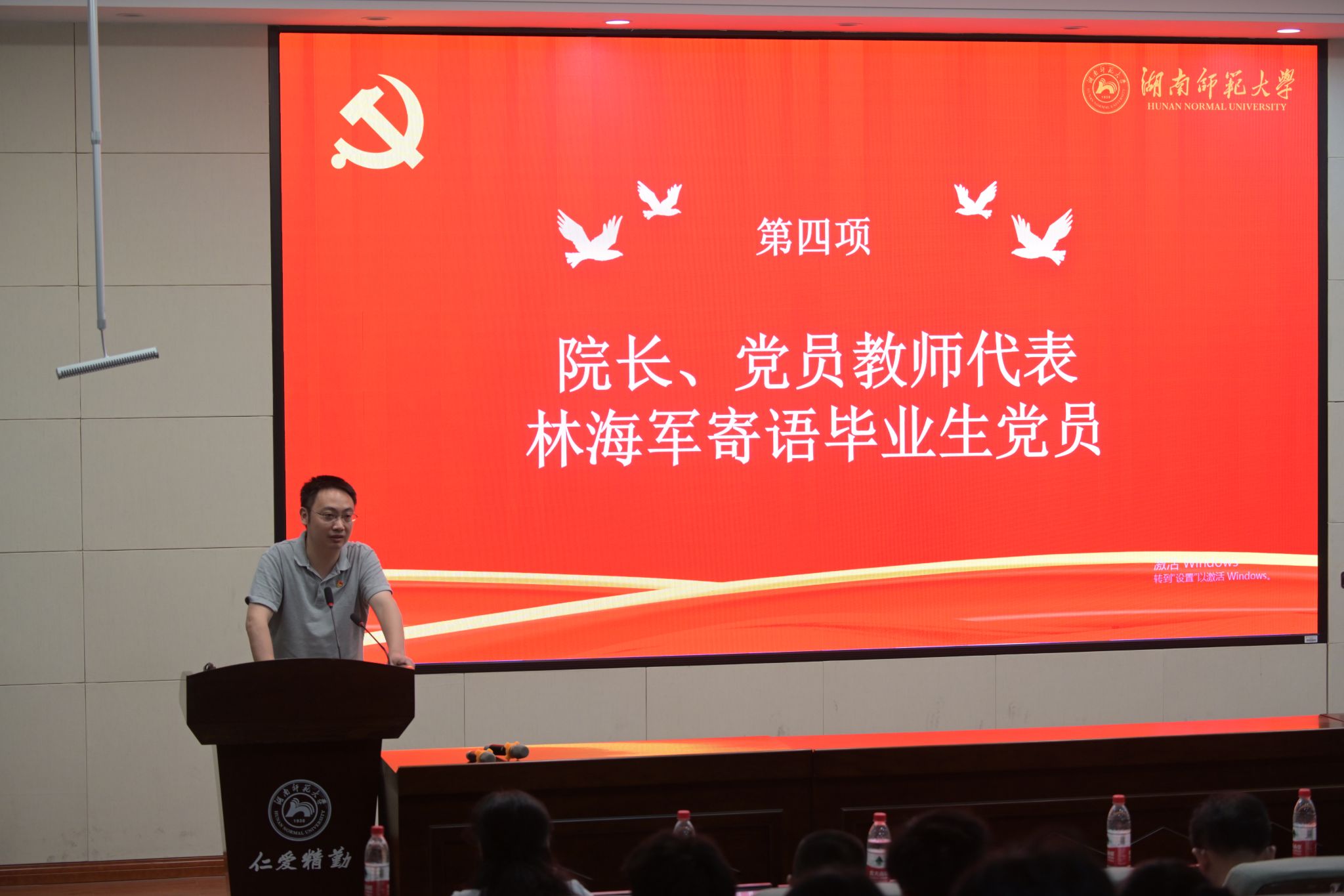 (通讯员 申梦博 图 黄璞)5月17日上午,工程与设计学院后栋报告厅党徽熠熠,誓言铮铮,学院2024届毕业生党员“信仰与青春同行”毕业党课活动正在进行中。院党委书记梁勇,院长林海军,院党委副书记雷道金出席,活动由院党委专职组织员刘晓燕主持。