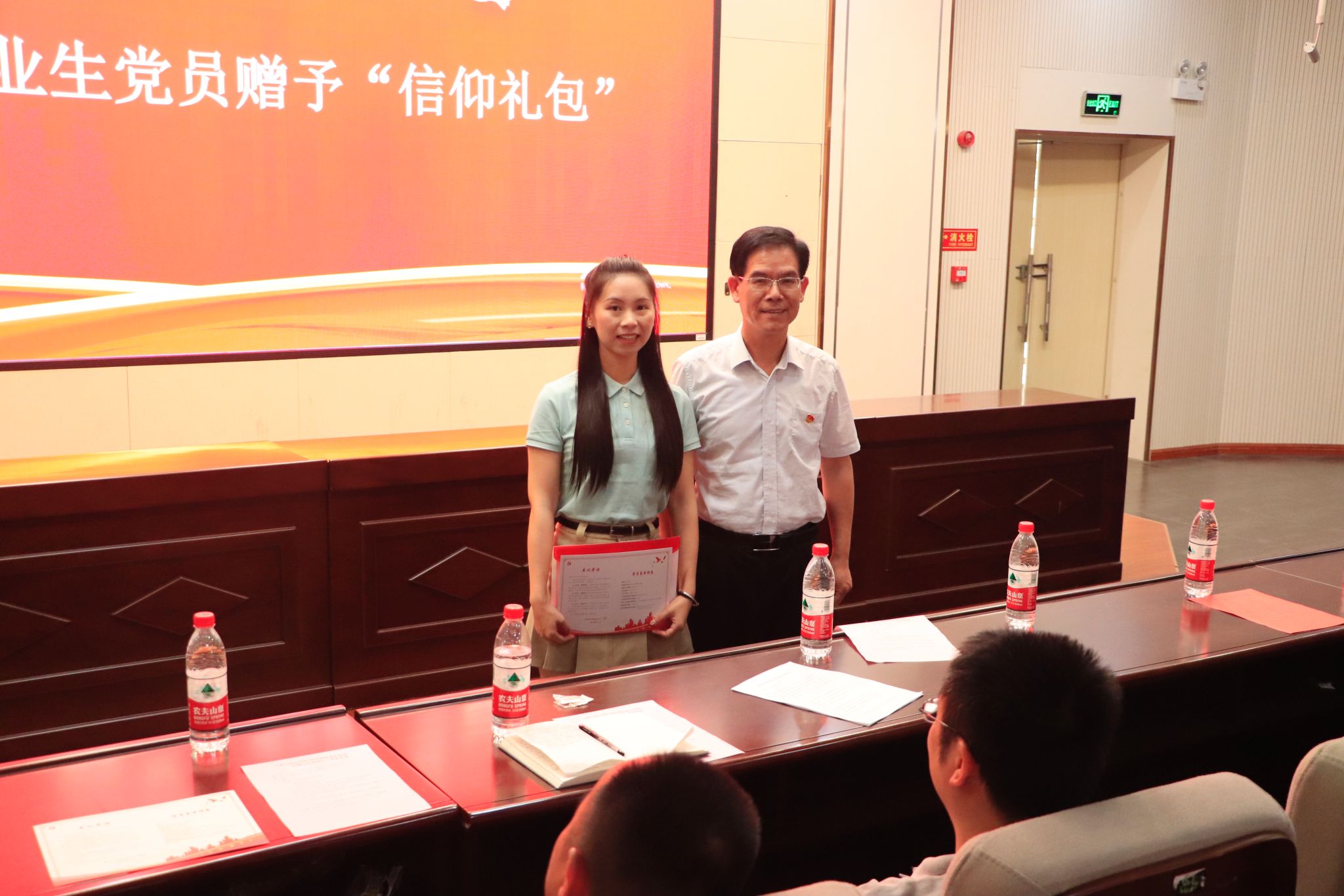 梁勇为毕业生党员代表赠予“信仰礼包”。“礼包”里锃亮的党徽,提醒着毕业生党员永远铭记党员身份,不忘初心,践行誓言;《中国共产党纪律处分条例》一书提醒同志们认真学原文,心中有戒,行有所止;“礼包”里还有学院为毕业生党员一一订做的《党员信息卡》,上面印制了党委书记的殷殷嘱托和党员的重要身份信息;《党员组织关系转移注意事项》则温馨提醒各位党员,严格按照党内组织生活原则,执行党的组织纪律。