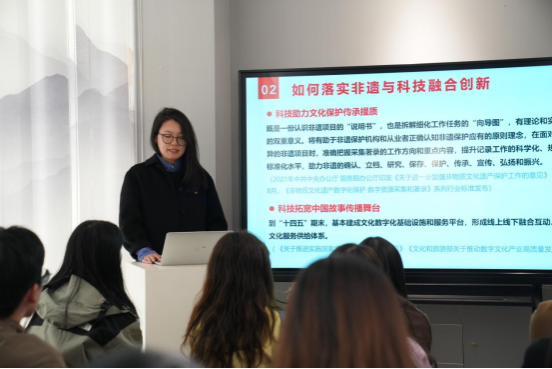 党员同志们来到位于桃子湖的“非遗+科技”创新研发中心,首先听了一堂“科技赋能非遗,增进文化自信”的微党课。艺术设计系教工党支部王玥老师带领同学们深入学习践行习近平文化思想,就“推进文化与科技深度融合”这一命题,分享了自己的认识与体会。王玥说,科技赋能非遗传承及创新发展,呈现勃勃生机及光明前景。王玥介绍了非遗与科技融合创新的实践路径,指出科技助力文化保护传承提质、拓宽中国故事传播舞台、塑造文化多元业态以及促进产业转型升级等方面大有可为。王玥鼓励党员同志要以习近平文化思想为指导,锚定建成文化强国战略目,积极投身文化科技融合创新实践,为实现中华民族伟大复兴的中国梦贡献力量。