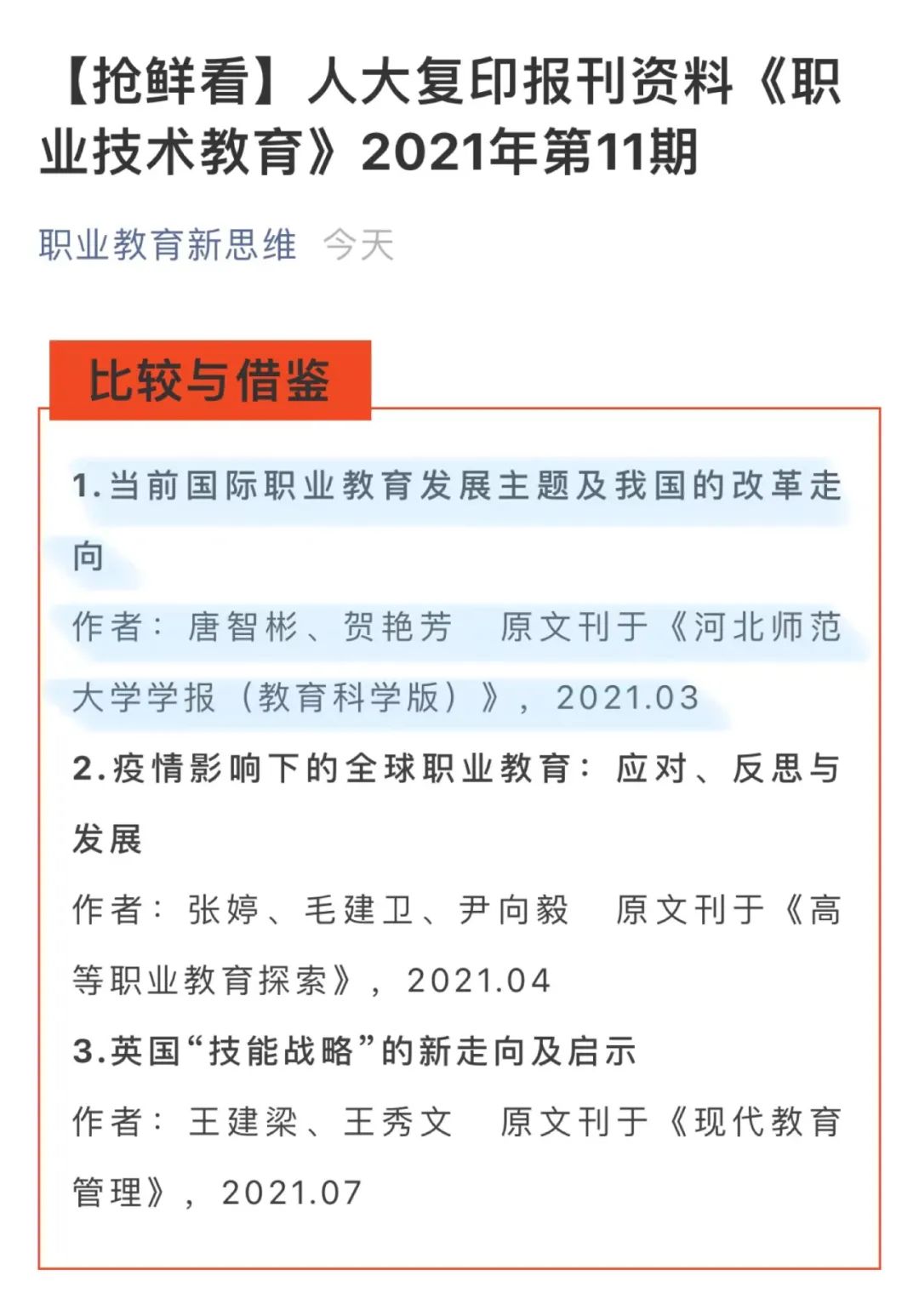 近期,我所研究成果《当前国际职业教育发展主题及我国的改革走向》被人大复印报刊资料《职业技术教育》2021年第11期全文转载,并被《新华文摘》第20期“论点摘编”栏目选摘。该成果原发表于《河北师范大学学报教育科学版》2021年第3期,由唐智彬教授和贺艳芳博士完成,是湖南省哲学社会科学基金一般资助项目的阶段性研究成果。